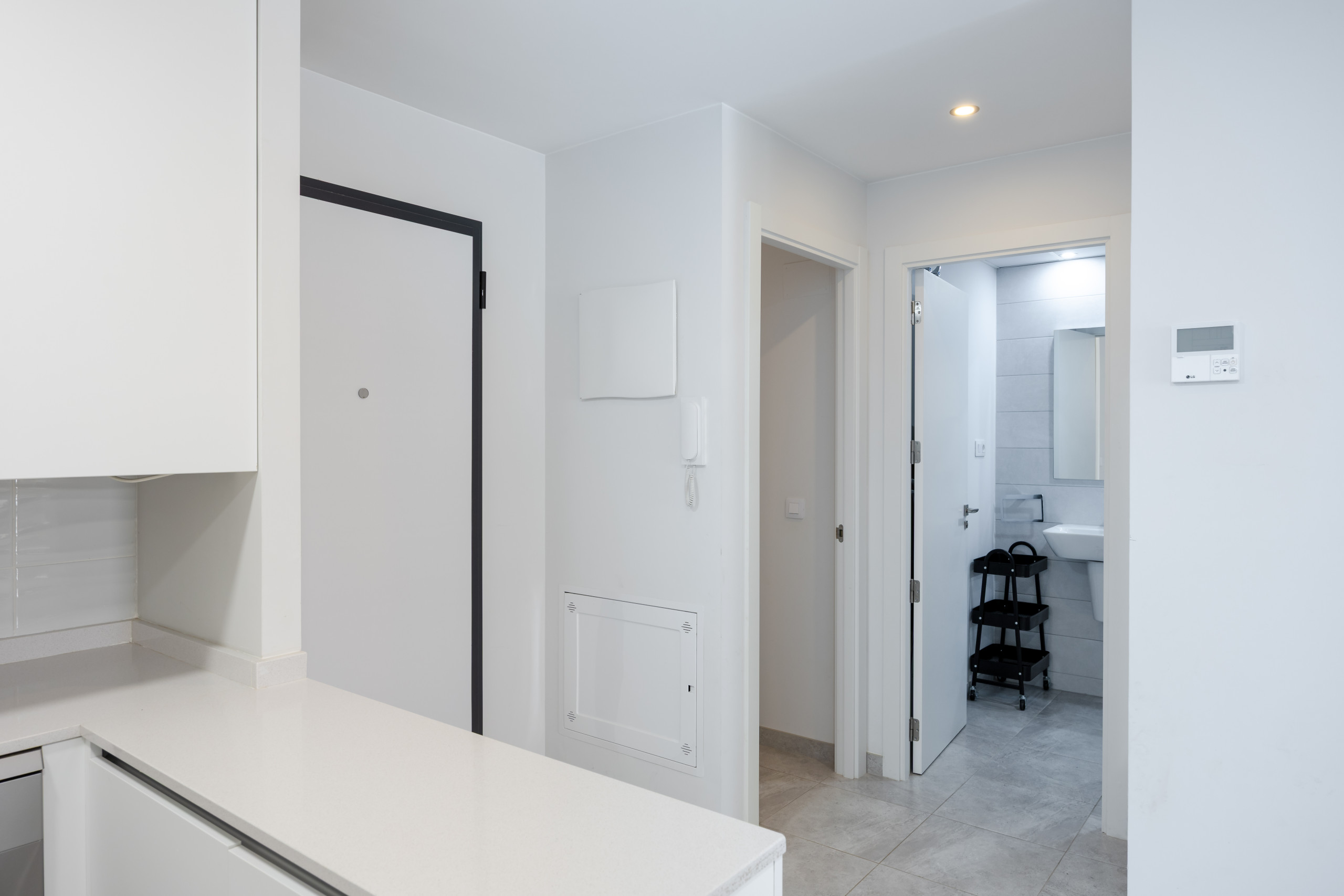 Gelegen op de eerste verdieping en op de hoek, geniet het appartement van meer privacy en helderheid dankzij zijn grote ramen van vloer tot plafond en zijn open ontwerp.