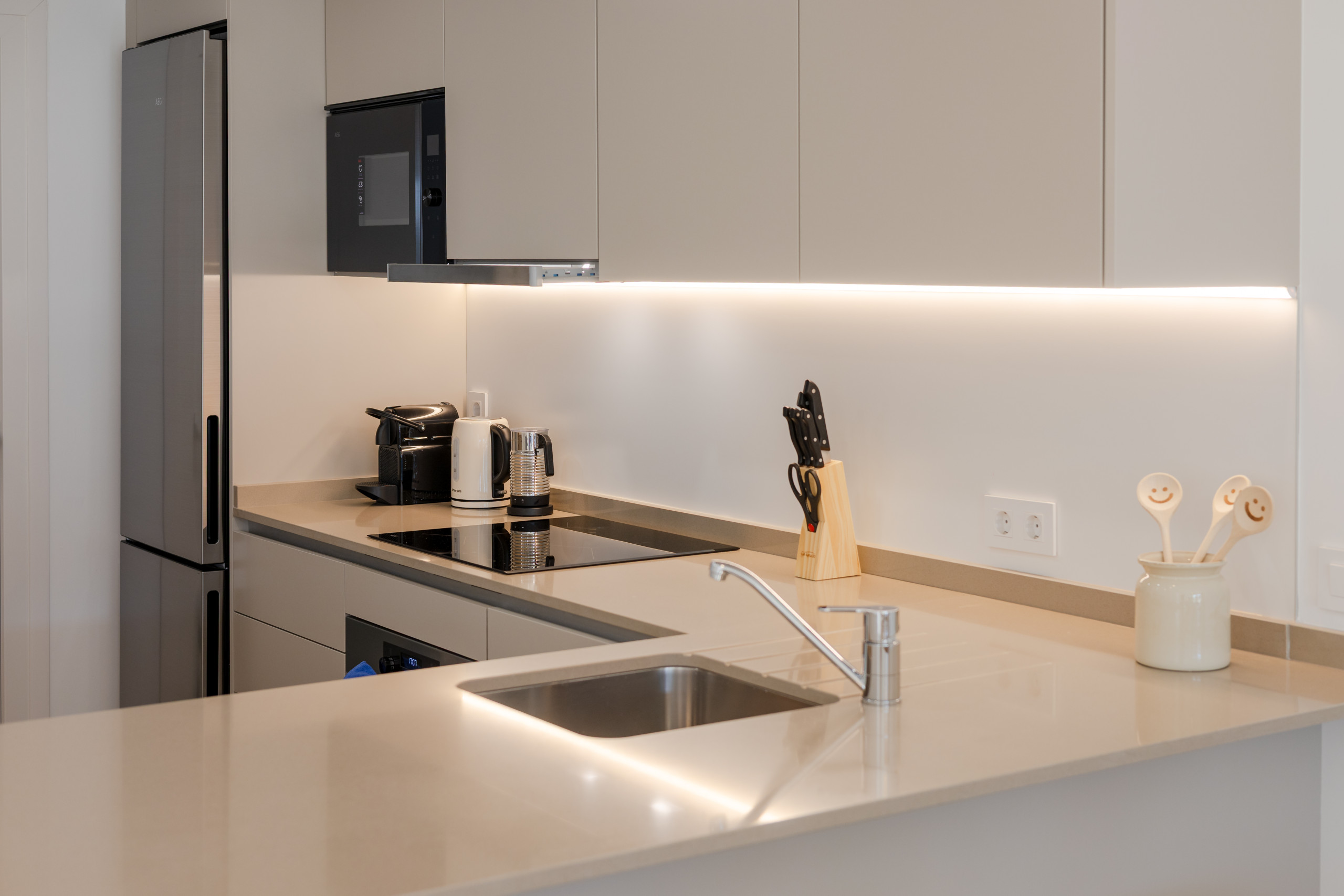 Volledige huishoudelijke apparaten (koelkast, vriezer, oven, magnetron, vaatwasser, koffiezetapparaat, broodrooster, waterkoker).