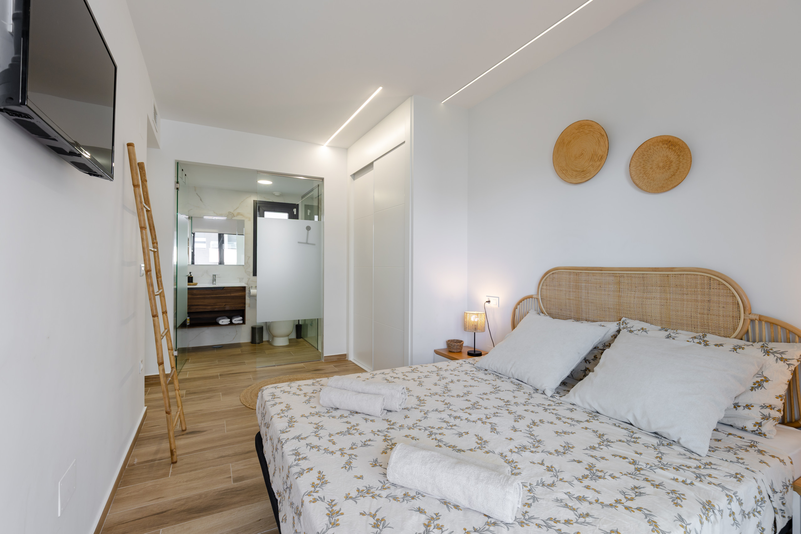 Suite Principal: Cama de matrimonio (160x200 cm), baño privado en suite y armario espacioso.