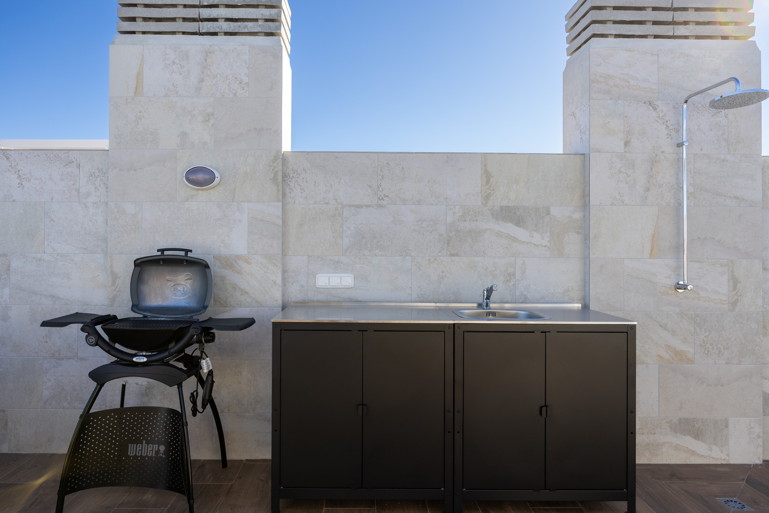 Terraza privada con jacuzzi en la azotea, muebles de jardín, cocina exterior y barbacoa