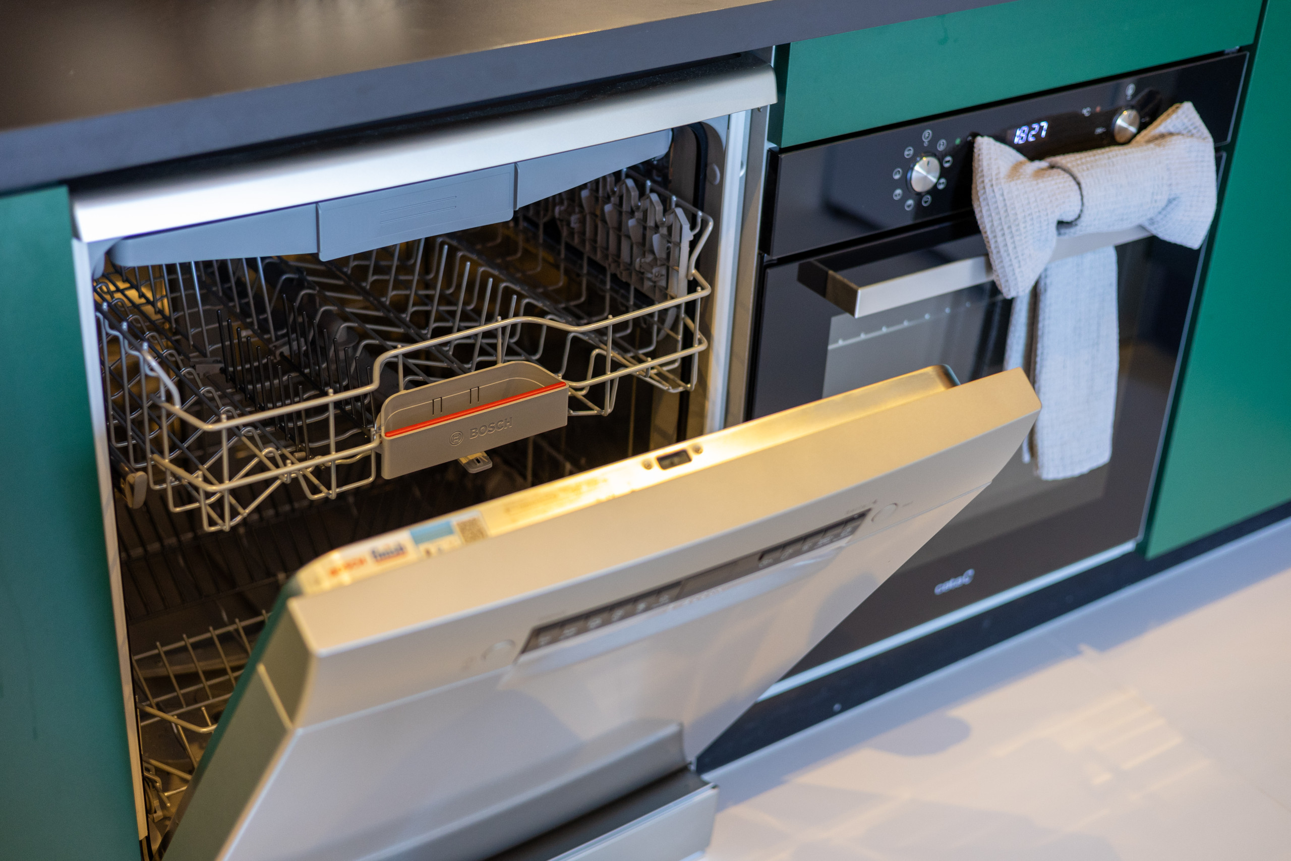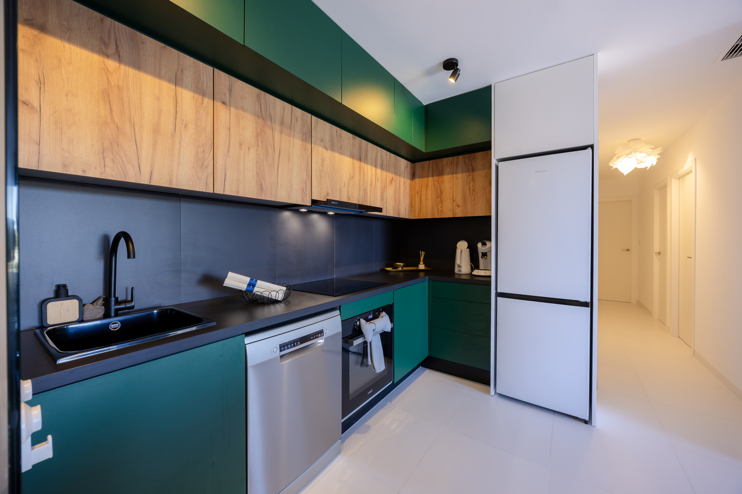 Elegante cocina de concepto abierto con electrodomésticos de calidad (frigorífico, congelador, horno, lavavajillas, cafetera, hervidor y tostadora), además de todos los utensilios necesarios para tu estancia. Dispone de amplio espacio de almacenamiento.