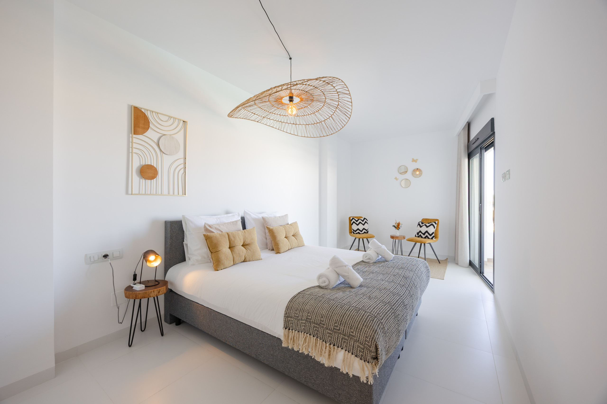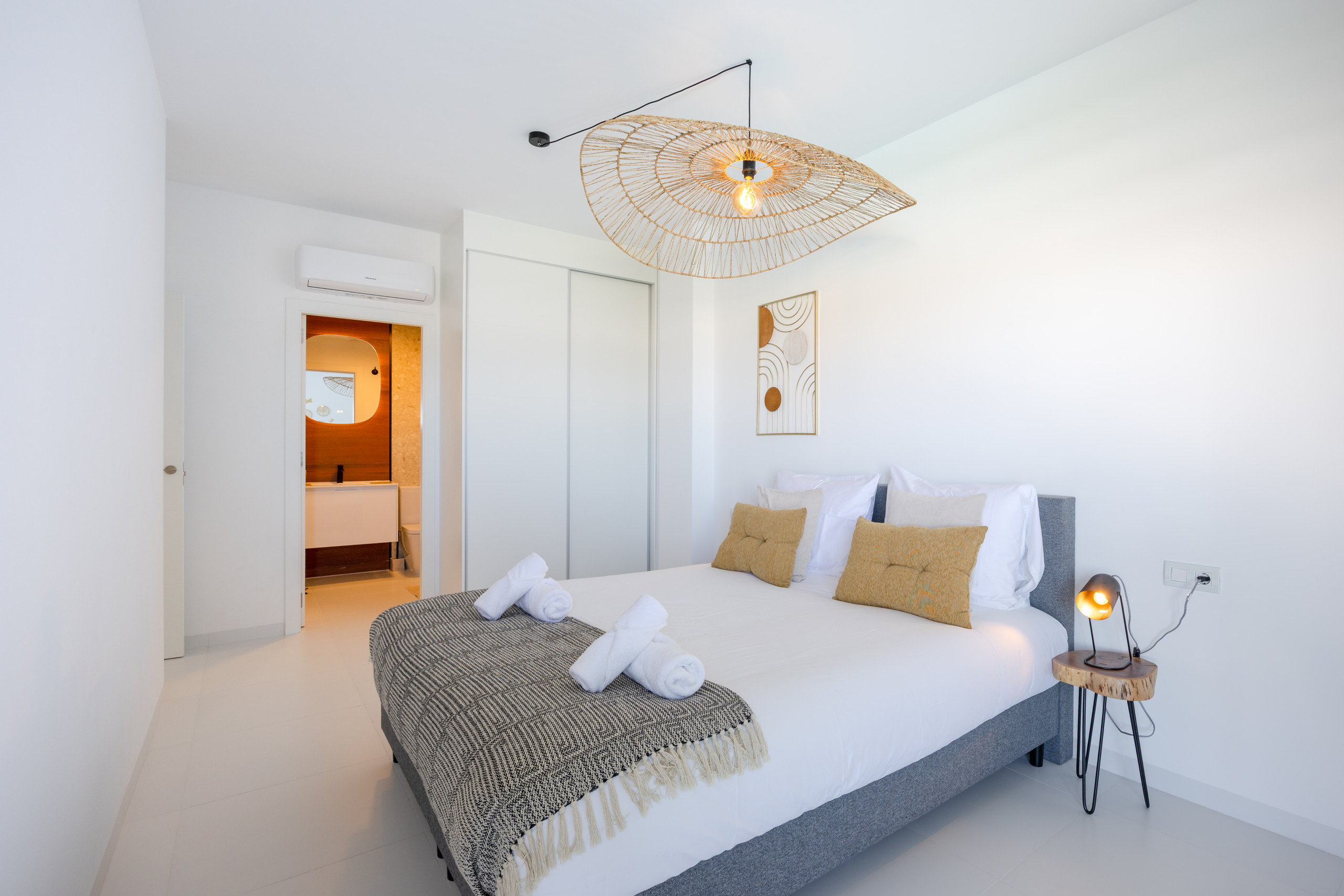 Dormitorio principal con cama de matrimonio, baño en suite, armario amplio y acceso directo a la terraza.