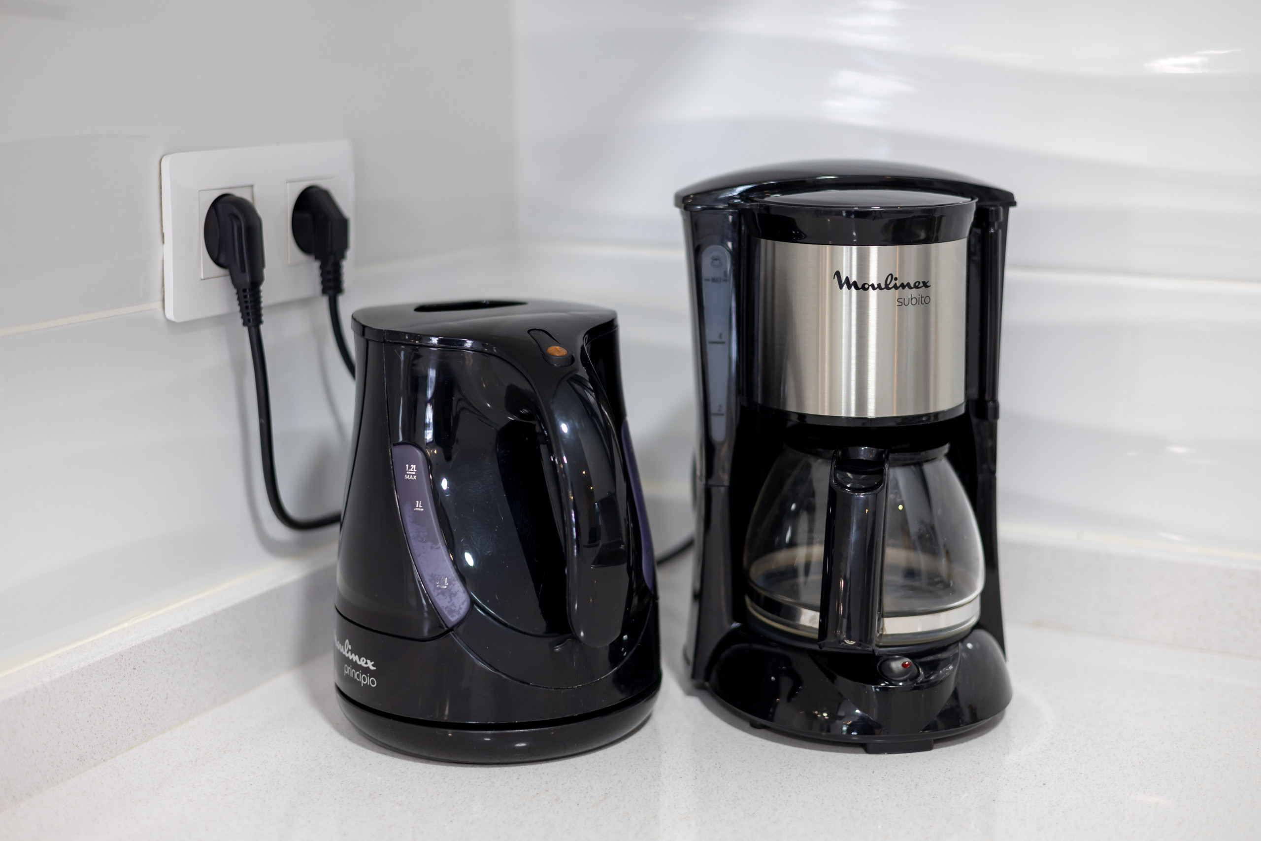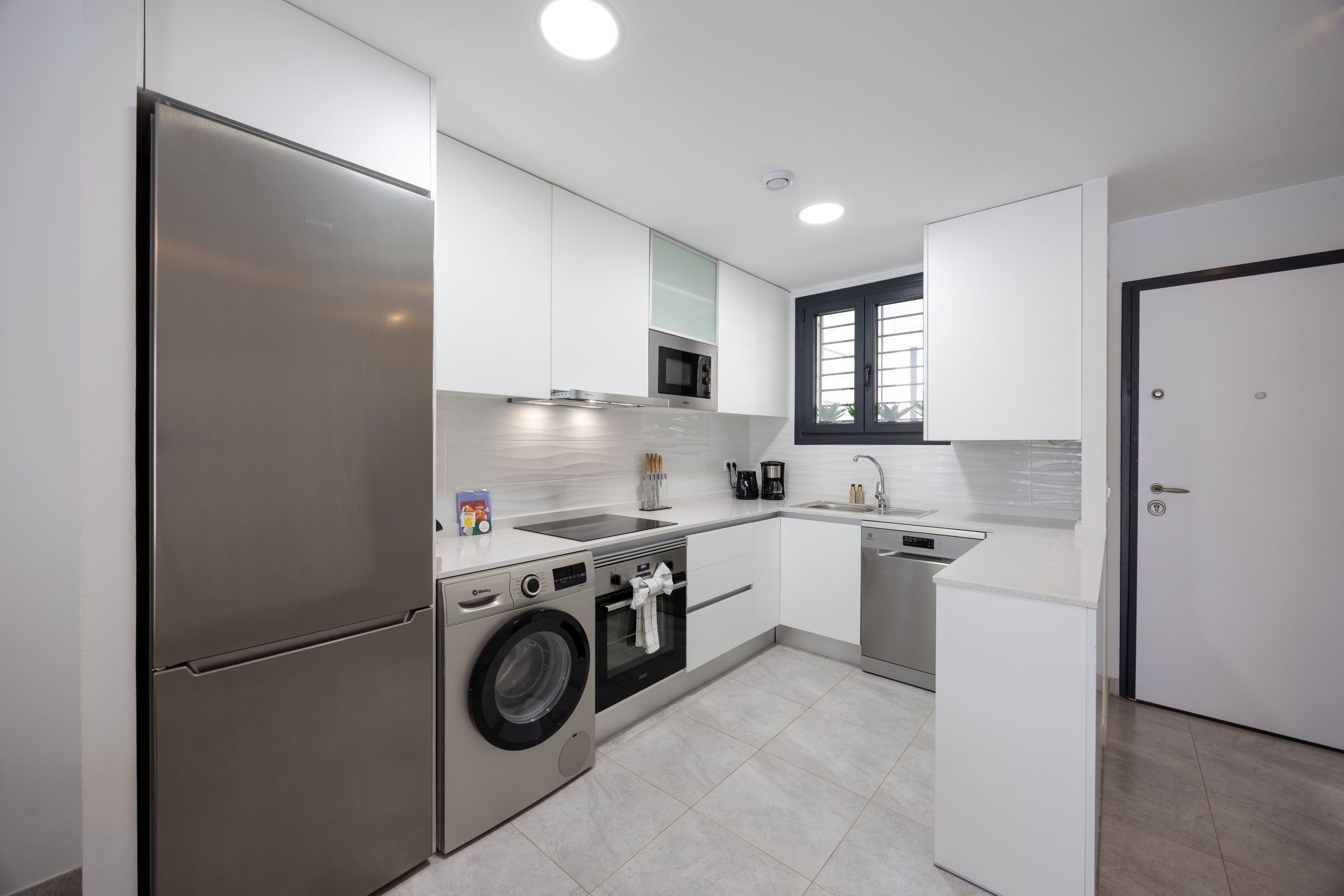 High-end appliances: refrigerator, freezer, oven, microwave, dishwasher, coffee maker, kettle and toaster