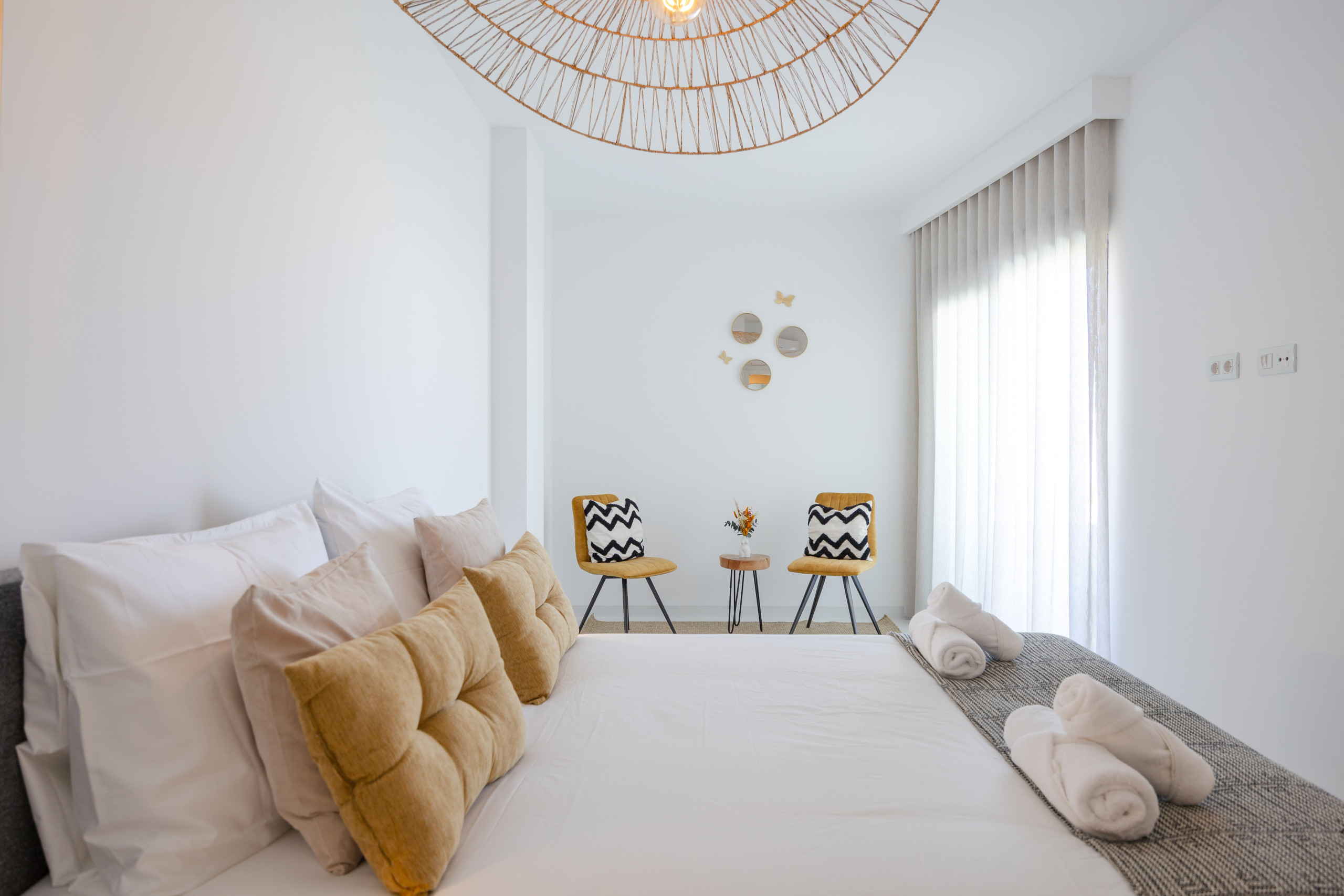 Main bedroom with a double bed, en-suite bathroom, spacious wardrobe, and direct access to the terrace.